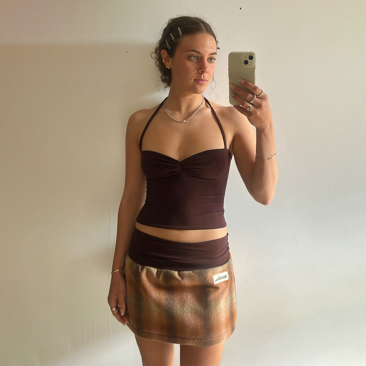 This garment is handmade in Melbourne from a beautiful thick wool fabric. It features a wide waistband that can be worn scrunched or long, and has an embroidered enala patch.